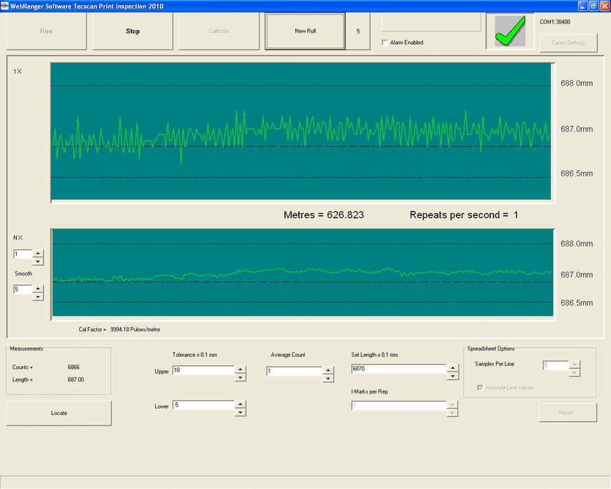 The WEBRANGER is a unique system devoted to the analysis, measurement and control of repeat (pitch) length and substrate variation on the run. Accurate to within 0.1 mm per metre the system produces printed reel or job reports. Designed and operated in Windows for ease of use and user friendly operation. The WEBRANGER outputs two independent analogue signals directly proportional to the error. This enables automatic closed loop control of repeat length. On screen graphics display each repeat variation as well as a scrolling job result. All ColourScan web inspection systems past and present can be upgraded to include the Web Ranger Repeat Length Measurement system. With newer state of the art substrates available, repeat length measurement is essential for trouble free print runs with such sensitive materials.